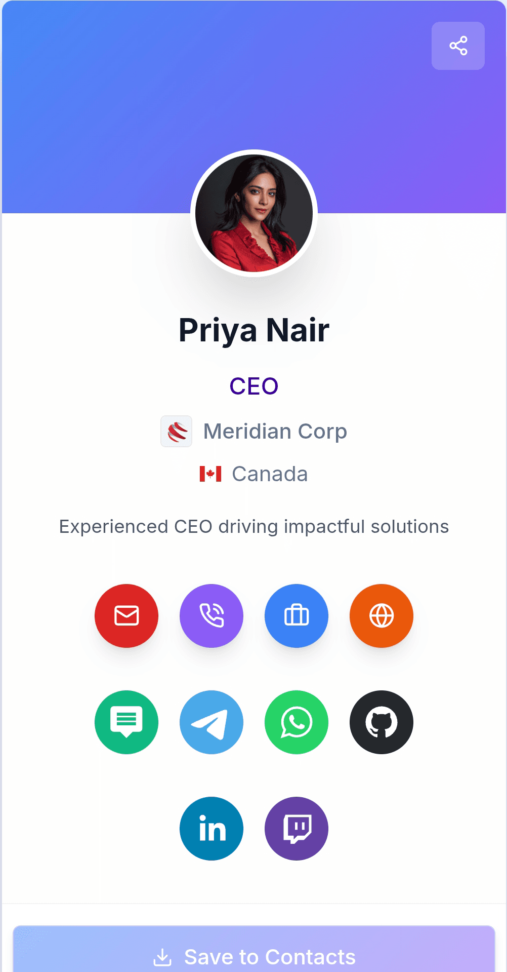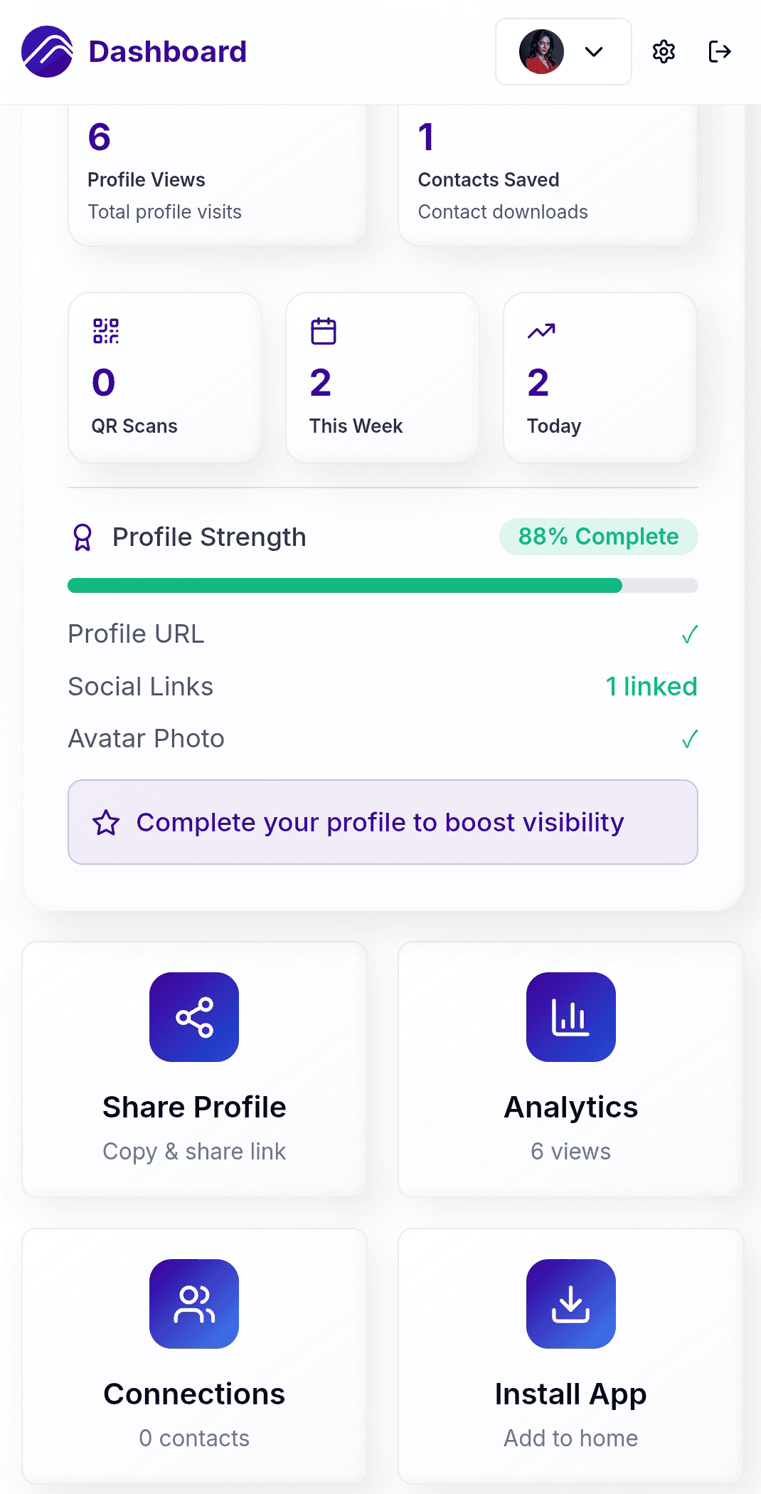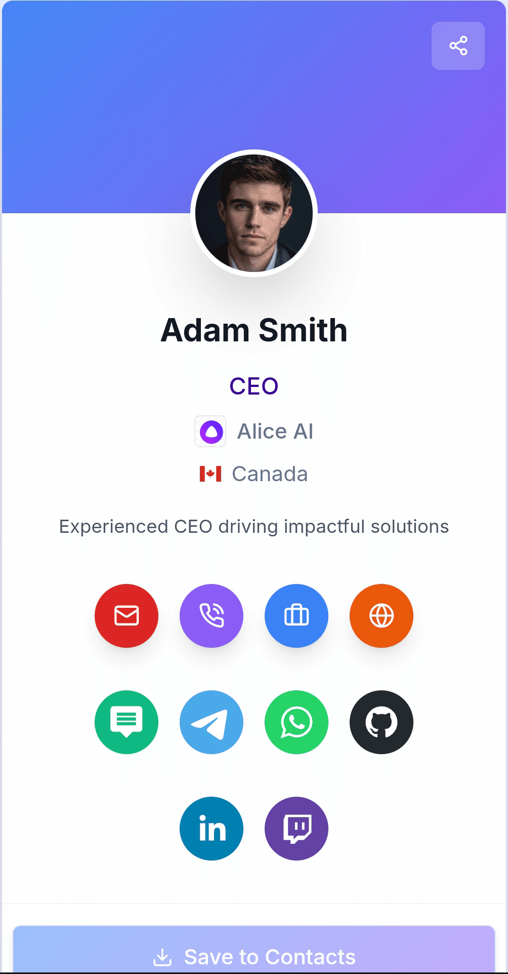 Tap with NFC or scan a QR code. Your profile saves instantly, and updates in real time.