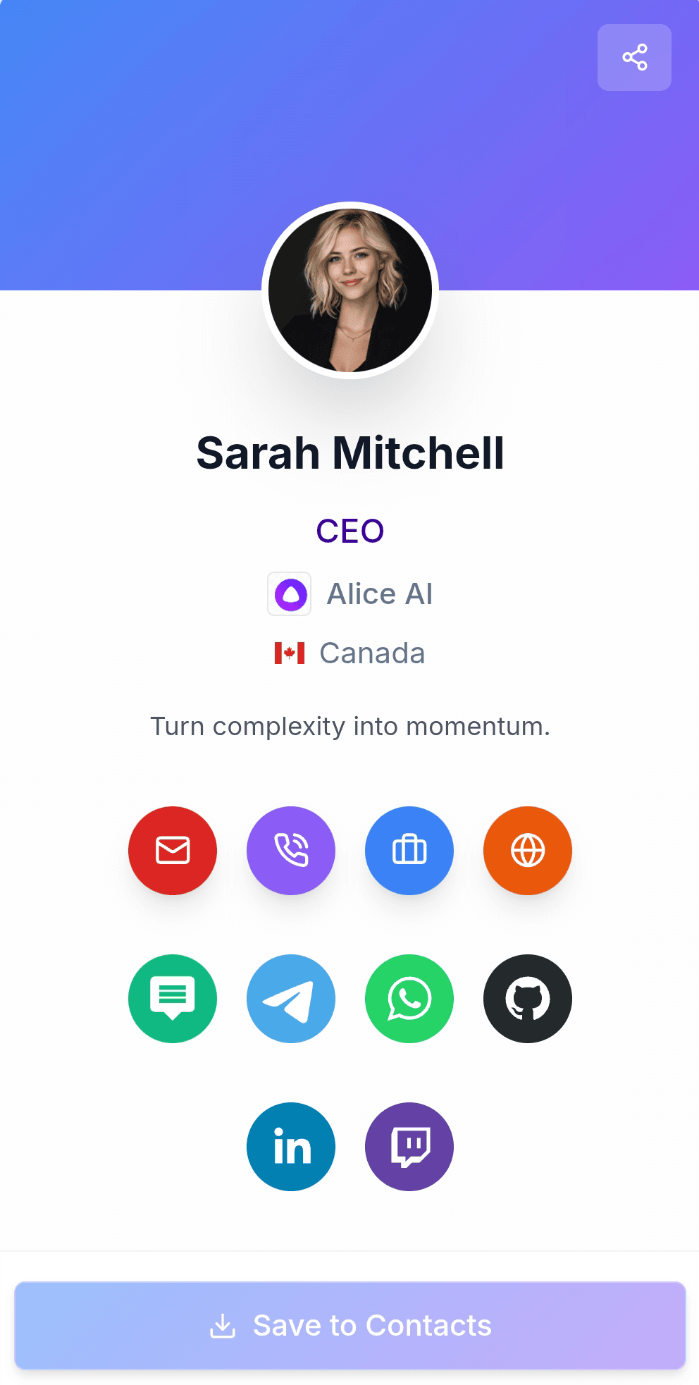 Create multiple personal profiles and select which one to share in any interaction — based on role, organization, or purpose.