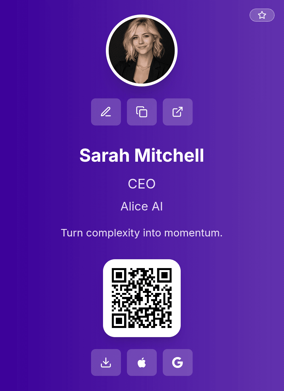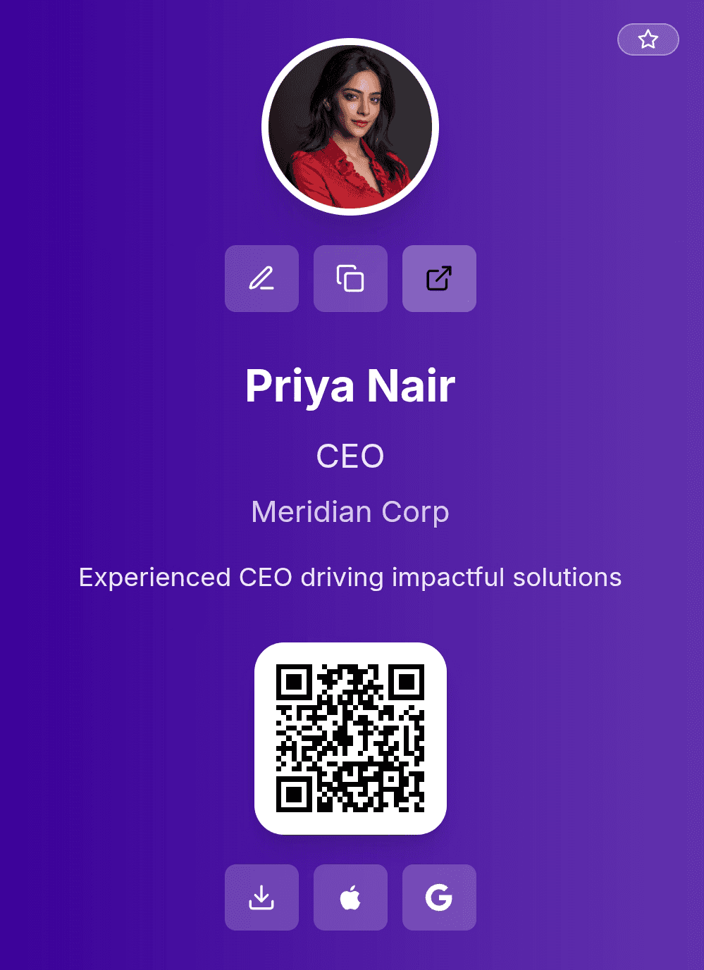 Create multiple profiles. Choose what to share. Tap, scan, or save to wallet. Built for professionals, enterprises, and events.